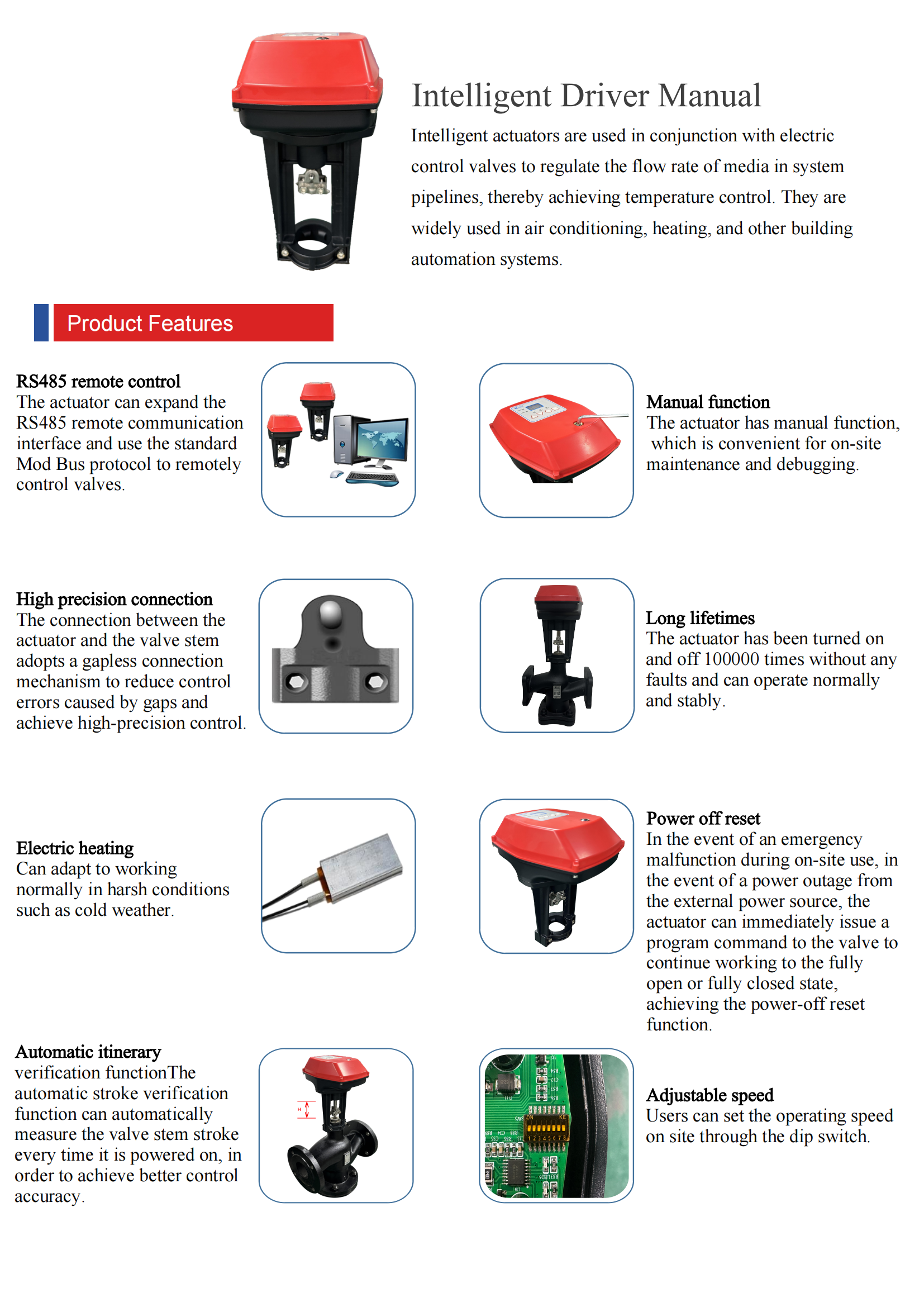 Intelligent actuator and electric control valve supporting the use of the system can be achieved in the pipeline to achieve the function of regulating the flow of the medium to achieve temperature control, widely used in air conditioning, heating and other building automatic control system.